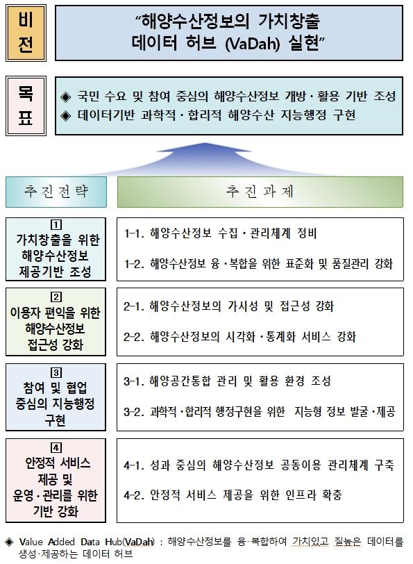 이번 종합계획에서는 ‘해양수산정보의 가치 창출 데이터 허브 실현‘이라는 비전 아래, 가치 창출을 위한 해양수산정보 제공기반 조성, 이용자 편익을 위한 해양수산정보 접근성 강화, 참여 및 협업 중심의 지능행정 구현, 안정적 서비스 제공 및 운영·관리를 위한 기반 강화 등 4대 전략과 8대 추진과제를 제시했다.