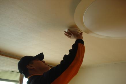 단독경보형감지기는 전기배선을 따로 설치할 필요 없이 감지기 내부에 건전지를 넣어 천장에 부착하면 된다.