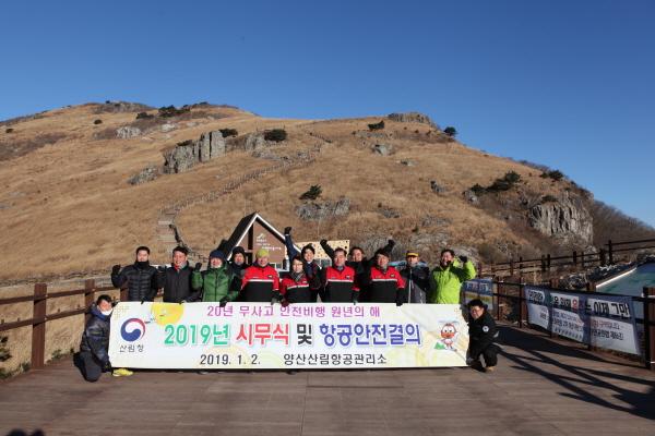 산림청 산림항공본부 양산산림항공관리소는 지난 2일 울산광역시 울주군 간월산 간월재에서 기해년 시무식과 더불어 20년 무사고 안전비행 목표 달성을 위한 항공안전결의를 다지고 새해 업무를 시작했다.