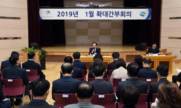 의정부시는 3일 오전 8시 의정부시청 대강당에서 국·단·소·권역동장 및 각 부서장 80여명이 참석한 가운데 2019 기해년 첫 확대간부회의를 개최하고 국별 주요 현안사항 등에 대한 보고와 토의의 시간을 가졌다.