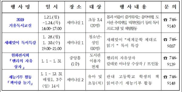 또한, 28일과 30일 저녁 7시부터 도서관 세미나실 1에서는 청소년부터 성인일반을 대상으로 새해맞이 ‘세계문학 제대로 읽기’라는 주제로 "나는 이기적으로 읽기로 했다"의 저자 박노성 열음자기경영연구소 대표를 초청하여 독서특강을 진행한다.