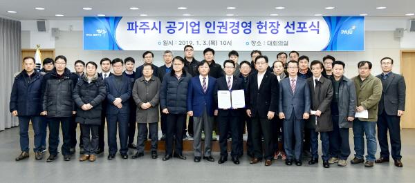 파주시 공기업 직원대표 상수도과 김병욱 주무관과 하수도과 문보경 주무관이 인권 관련 국내외 규범의 준수, 모든 이해관계자에 대한 차별금지, 노동, 산업환경, 환경보호 등 9개 원칙을 담은 인권경영 선언문을 낭독함으로써 인권경영의 실천을 약속하고 인권경영의 정착과 확산을 위해 실천할 것을 다짐했다.