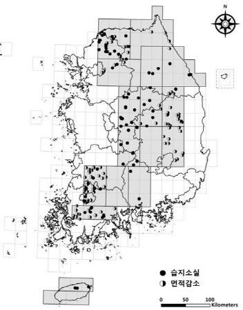 면적이 감소된 습지 91곳은 전라 52곳, 경기 19곳, 경상 12곳, 강원 8곳 순이었다.