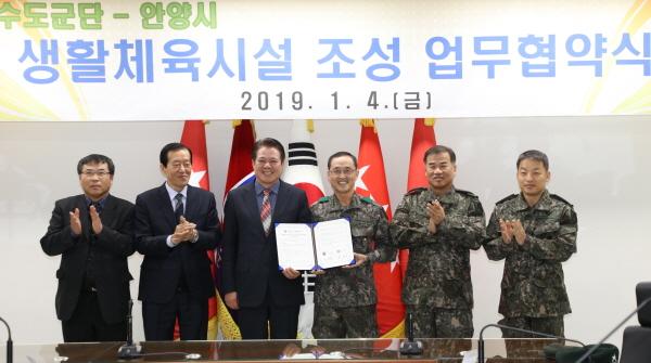 양 기관을 대표한 이날 협약에 따라 안양시는 사업비 16억 원을 들여 육군수도군단 내 운동장에 축구장, 족구장, 풋살장, 육상트랙 등의 체육시설을 조성하기로 했다. 부대시설로 화장실과 주차장도 신설한다.