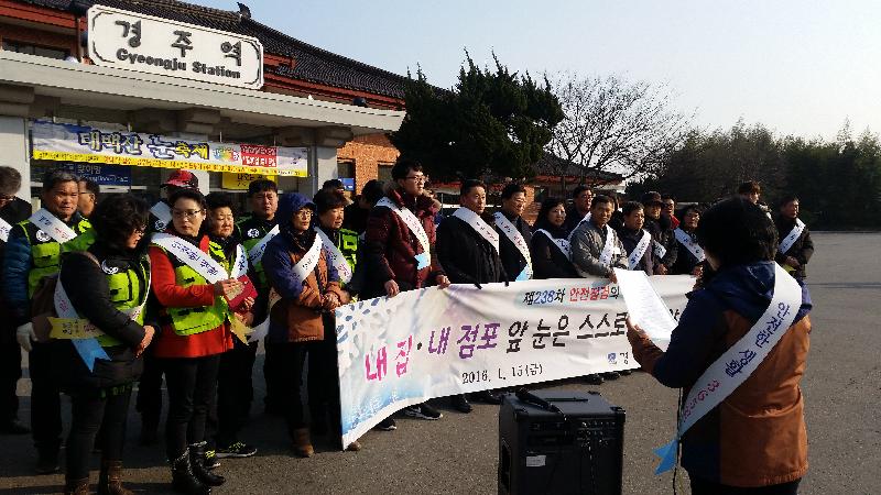 경주시는 지난15일 제238차 안전점검의 날을 맞아 공무원 및 경주시 재난안전네트워크, 안전모니터봉사단, 황오동 지역자율방재단 등 80여 명이 참가한 가운데 경주역 광장에서 안전문화 캠페인을 실시했다. 이날 캠페인은 건축물․보도․이면도로․시설물과 지붕에 대한 제설․제빙작업이 의무화됨에 따라 경주역을 이용하는 관광객 및 시민들에게 ‘내 집․내 점포 앞 눈은 내가 치워야 합니다’와 강설 대처 요령이 수록된 홍보전단과 자동차 성에 제거제를 배부하며 안전사고 예방 활동을 전개했다.최병한 안전재난과장은 안전사고는 언제 어디서 발생할지 모르는 예측 불가의 사고로 다가오는 설 명절과 동절기 각종 안전사고 예방에 철저한 당부를 하면서 시에서도 안전사고 예방 홍보활동을 꾸준히 전개해 시민들의 안전문화에 대한 관심을 제고하도록 노력 하겠다”고 했다.// 김희철 기자 khc4236@hanmail.net