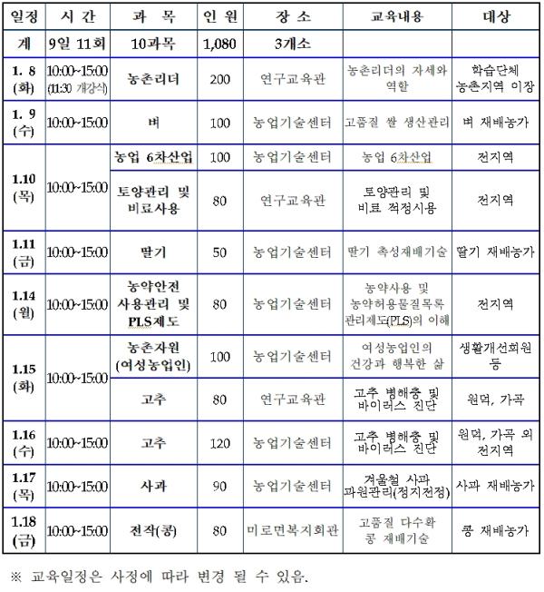 이번 새해농업인실용교육은 새로운 기술 및 경영·유통 등 6차산업을 뒷받침하고, 국내·외 농업여건의 변화에 대응할 수 있는 농업경쟁력 제고와 농촌자원 개발과 관광산업 연계 등 농업인의 소득증대에 중점을 두고 추진한다.
