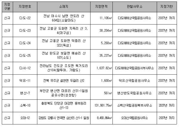 환경부 산하 국립공원관리공단은 오대산 1곳, 덕유산 1곳, 소백산 1곳, 변산반도 1곳, 다도해해상 5곳 등 총 9곳을 '국립공원 특별보호구역'으로 7일부터 지정하여 2037년까지 관리한다고 밝혔다.