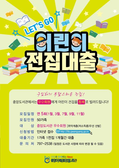 어린이 전집대출 서비스에 관한 자세한 사항은 중앙도서관(☎797-2538)로 연락하면 된다.