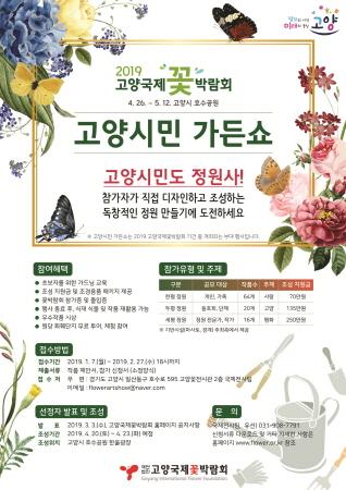 재단법인 고양국제꽃박람회는 오는 4월 26일부터 5월 12일까지 고양시 일산 호수공원에서 열리는 2019고양국제꽃박람회의 ‘고양시민 가든쇼’ 참여 시민을 모집한다고 밝혔다.