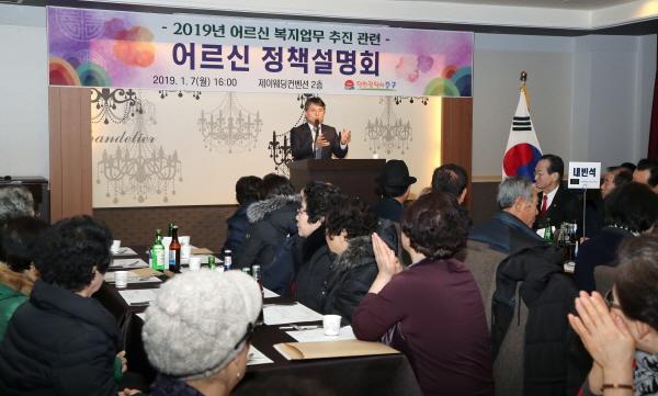 홍인성 중구청장은 인사말씀을 통해 “2019년 새해를 맞이하여 어르신들을 모시고 복지 정책에 관한 설명회를 갖게 되어 매우 기쁘게 생각하며 앞으로도 구에서는 어르신들의 풍요롭고 안락한 노년 생활을 위한 복지정책 제공에 최선을 다하겠다”고 전했다.