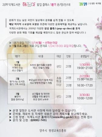 양주시 덕계도서관은 오는 14일부터 2019년 문화가 있는 날 ‘팝업 클래스’ 1분기 참여자를 선착순 모집한다.
