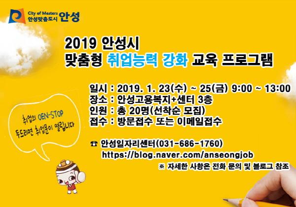 “2019 안성시 맞춤형 취업능력 강화 프로그램”은 안성시에서 주최하는 계층별 취업프로그램으로 취업스킬과 안성의 지역 특성을 고려한 특화된 교육내용을 바탕으로 취업역량 강화 및 제 2의 인생 설계를 통한 성공적인 취업을 위한 교육과정으로 이루어져 있다.