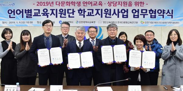 인천광역시교육청은 9일다문화학생 학교생활 적응 지원을 위해 인천광역시, 다문화가족지원거점센터, 경인교대와 함께 "언어별 교육지원단 학교 지원 사업" 공동추진 업무협약을 체결했다.