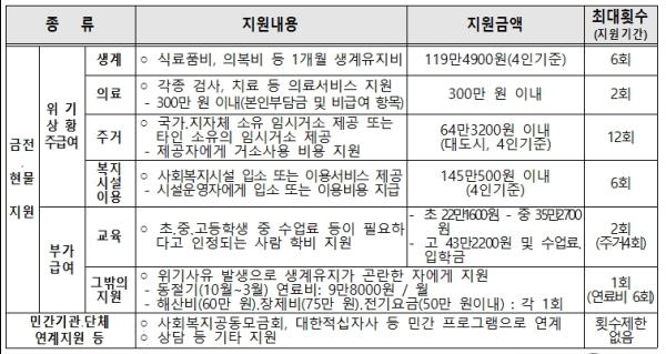 긴급지원대상자로 선정되면 신청 후 2일 이내 위기상황에 따라 생계·주거·의료 등의 지원을 받을 수 있으며, 필요성이 인정되면 동절기 연료비 또는 교육지원 등을 추가로 지원 받을 수 있다.