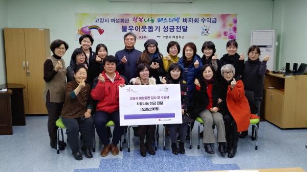 고양시 여성회관은 지난해 12월 개최한 ‘2018 여성회관 행복나눔 페스티벌’ 사랑나눔 바자회 판매수익금 5백2십8만2천2백 원 전액을 불우이웃에게 사용될 수 있도록 지난 9일 경기북부 사랑의 열매에 기탁했다.