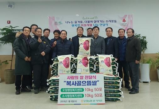 지난 9일 오정농협쌀작목반에서 황금돼지 새해를 맞아 지역의 어려운 이웃들과 함께 사랑을 나누고자 부천시 소사본동 행정복지센터에서 ‘이웃사랑 백미 전달식’을 가졌다.