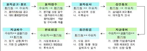 분야별로는 재활용산업육성자금 1,284억 원, 환경개선자금 620억 원, 환경산업육성자금 455억 원, 천연가스공급시설설치자금 49억 원이며, 융자신청 접수는 분기별로 진행된다.