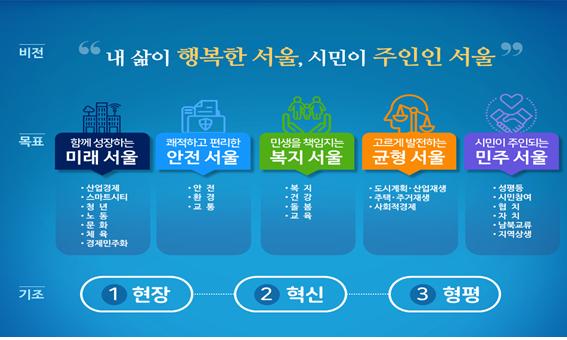 5대 목표는 함께 성장하는 ‘미래 서울’, 쾌적하고 편리한 ‘안전 서울’, 민생을 책임지는 ‘복지 서울’, 고르게 발전하는 ‘균형 서울’, 시민이 주인 되는 ‘민주 서울’이다.