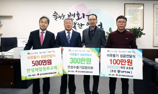 안성시에 이웃을 위한 따뜻한 나눔의 손길이 이어져 주위를 훈훈하게 하고 있다. 11일 안성수출기업협의회에서 이웃돕기 성금 300만원, 안성제일장로교회에서 의료비지원 성금 500만원, TEAM72 송윤종 회장이 이웃돕기 성금 100만원을 각각 기탁했다.