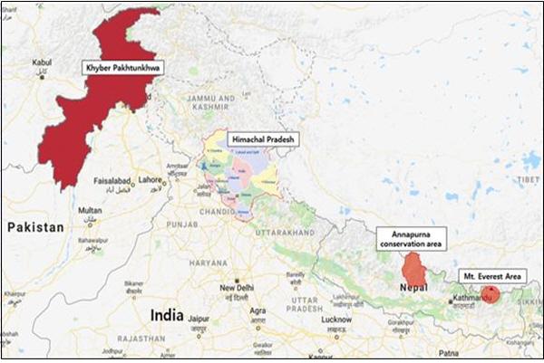 안나푸르나, 에베레스트 지역은 세계 최고봉이라는 상징성으로 산악 등반 등 관광객 유입이 많다. 히마찰 프라데시 지역과 카이버 파크툰콰 지역은 각각 쿨루-마날리 계곡과 카간 계곡이 위치해 여름철 산악 휴양지로 알려지면서 폐기물이 발생량이 늘고 있다.