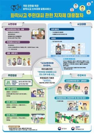 이번 종합안내서에는 주민알림·대피를 위한 세부절차, 중요 화학사고 대비물질 16종, 긴급재난문자 예시 등 지자체에서 주민대피를 결정할 때 즉각적으로 활용할 수 있는 내용을 위주로 수록했다.
