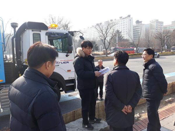 도로 먼지를 제거하는 도로청소차 운행 현장을 방문한 백운 제2부시장은 분진흡입차량에 동승해 도로청소차 운행에 대한 전반적인 설명을 들었다.