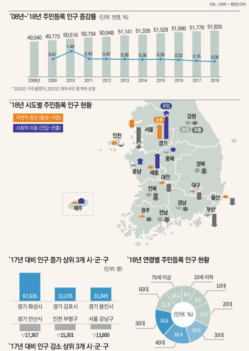 시·도별 인구를 보면 경기 20만 3258명을 비롯해 세종, 제주, 충남, 인천, 충북 등 6개 시도가 증가했다. 경기, 세종, 제주는 자연적 인구 증가와 타 시도로부터 순 유입이 많았다.