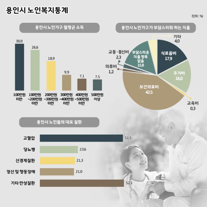 용인시 노인가구의 56.6%는 월평균 200만원 미만의 소득으로 지내는 것으로 나타났다. 노인들은 또 경제와 건강을 가장 큰 노인문제로 꼽았고, 주요 지출항목 가운데 보건·의료비 지출에 큰 부담을 느끼는 것으로 집계됐다.