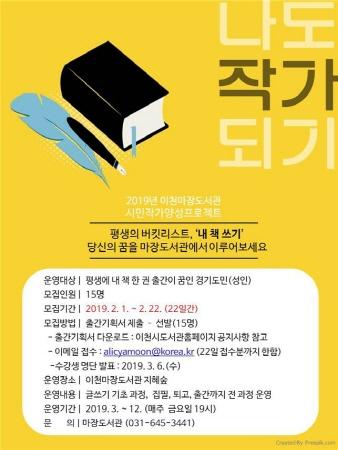 이천 마장도서관은 2019 시민작가 양성 프로젝트인 "나도 작가되기"사업을 추진한다고 밝혔다.