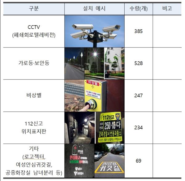 국민권익위, 경찰청, 지자체 등 관계 기관이 개선방안을 마련한 대상지점은 총 427곳이며, 설치 및 보완이 필요한 시설은 CCTV 385개 가로등·보안등 528개, 비상벨 247개, 112신고위치표지판 234개 등 총 1,463개다.