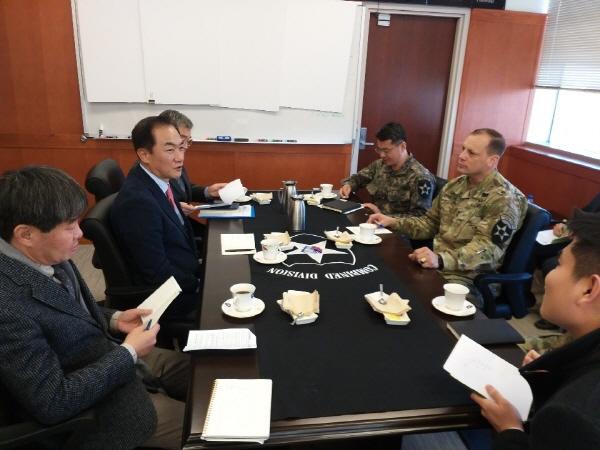 정장선 평택시장이 지난 16일 험프리내 미2사단 사령부를 찾아 맥킨 사단장과 한미간 교류 확대 방안에 대해 논의하는 자리를 가졌다.