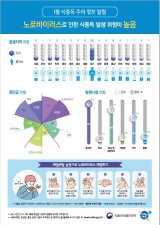 노로바이러스 식중독은 바이러스에 오염된 지하수 등에 의해 채소, 과일류, 패류 등이 오염돼 음식으로 감염될 수 있고 감염자와의 직·간접적인 접촉을 통해서도 쉽게 전파될 수 있다. 주요증상은 24∼48시간 이후 메스꺼움, 구토, 설사, 탈수, 복통, 근육통, 두통 등이다.