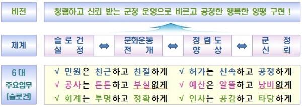 정동균 양평군수는 ‘소통하는 공직문화, 변화하는 청렴 양평’ 구현을 위해 ‘6대 주요 업무에 대한 슬로건인 민원은 친근하고 친절하게, 허가는 신속하고 공정하게, 공사는 튼튼하고 부실없게, 예산은 알뜰하고 낭비없게, 회계는 투명하고 정확하게, 인사는 공감하고 타당하게’를 설정하고 “전 부서 모든 공직자가 마음으로 실천하기 위한 청렴문화운동을 전개해 청렴한 양평군을 만들어 나가야 한다”며 강한 의지를 나타냈다.
