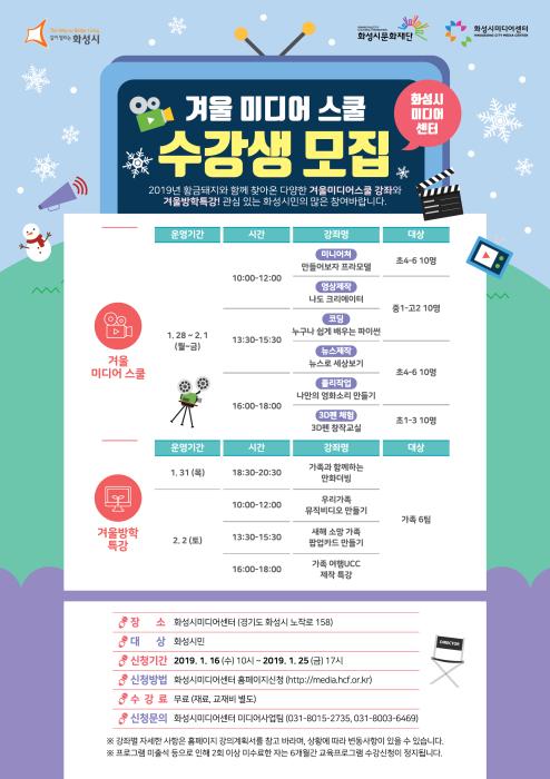 (재)화성시문화재단 미디어센터에서 ‘2019 겨울미디어스쿨’ 수강생을 모집한다. ‘2019 겨울미디어스쿨’은 겨울방학을 맞이한 초∙중∙고등학생을 대상으로 어린이 및 청소년들이 재미있게 미디어를 접하고 배울 수 있는 다양한 강좌로 진행된다. 이와 더불어 온 가족이 함께 미디어 체험을 즐길 수 있는 겨울방학특강도 마련하였다.