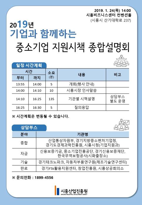 시흥산업진흥원(원장 정동선)은 오는 24일(목) 오후 2시부터 시흥비즈니스센터 2층 컨벤션홀에서‘2019 중소기업 지원시책 종합설명회’를 개최한다.
