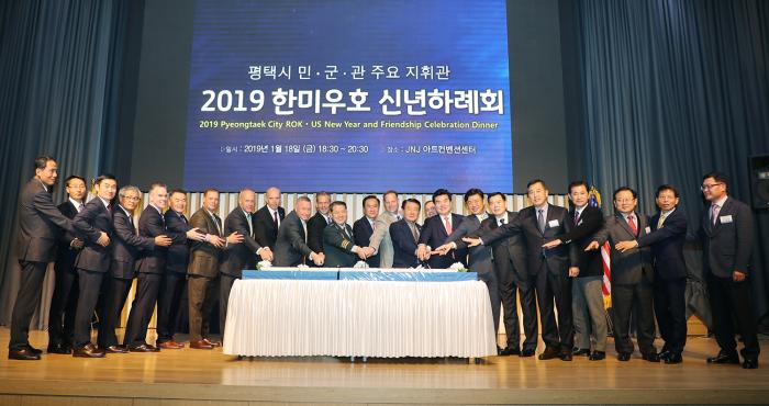 평택시(시장 정장선)가 18일 JNJ 아트컨벤션에서 관내 민ㆍ군ㆍ관 주요 지휘부 30여명을 초청 「2019 한미우호 신년 하례회」를 성황리에 개최했다.