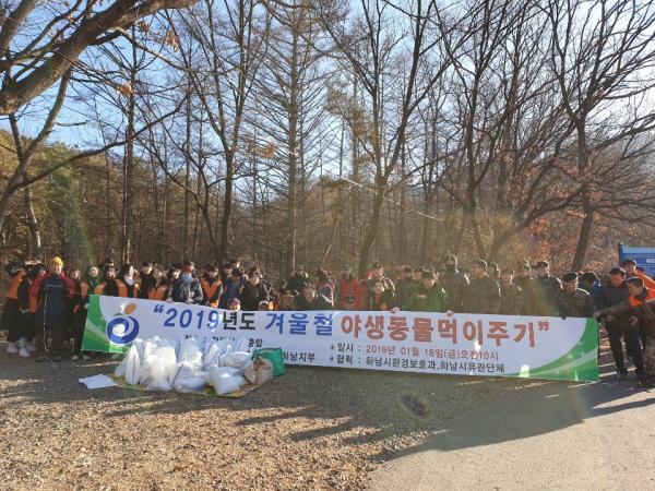 하남시는 검단산과 남한산 인근 겨울철 혹한기에 먹이를 구하지 못한 야생동물의 먹이 부족 현상을 해소하고 야생동물 서식지를 보호하기 위해 '야생동물 먹이주기 행사'를 가졌다고 21일 밝혔다.