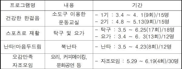 재활 프로그램은 소도구를 이용한 운동교실과 탁구 및 요가, 북 난타, 요리·커피메이킹·문화공연 등이며 부평구보건소 본관 3층 다목적실에서 진행한다.