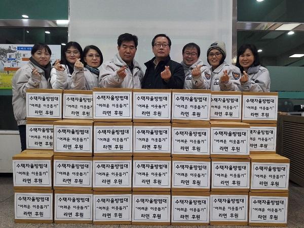 이날 전달된 라면은 수택자율방범대 회원들이 명절을 앞두고 어려운 이웃을 위해 써 달라며 전달한 것이다. 수택자율방범대는 현업에 종사하는 대원 15명이 자원해 회비를 걷고 찬조를 받아 기금을 모금해 지난 2017년부터 설을 즈음해 수택1동 주민센터에 라면을 꾸준히 지원하고 있다.
