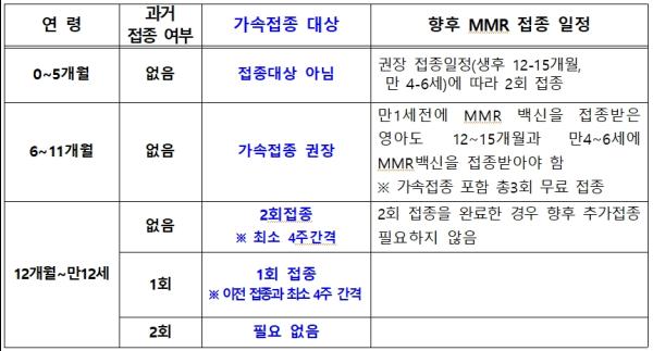 이번 안산시 가속접종 대상은 안산시에 주소를 둔 만6개월에서 만12세 아동 중 MMR접종 미도래자 1차 MMR을 접종하고 최소 4주가 지난 경우로 접종기간은 22일부터 2월 28일까지 가까운 국가예방접종 위탁의료기관에 MMR 백신구비 여부를 확인한 후 무료로 접종하면 되고 세부 기준은 표를 참조하면 된다.