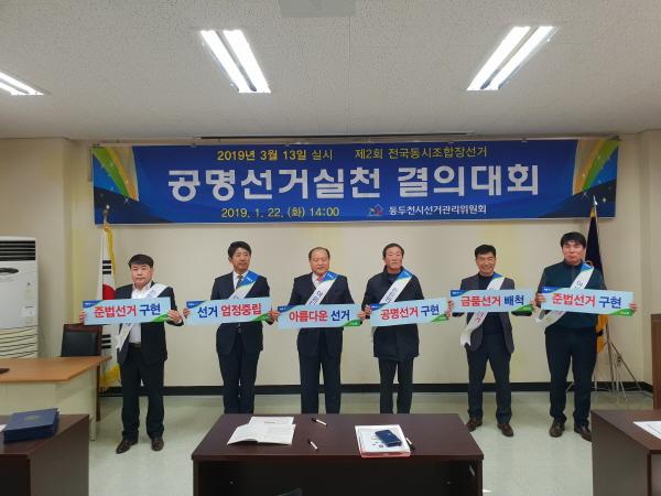 농협중앙회 동두천시지부는 지난 22일 동두천시선거관리위원회에서 오는 3.13전국동시조합장선거에 출마 예정인 정진호, 박찬희 후보 2인이 참석한 가운데 동두천시선거관리위원회와 함께 금품·부정선거 금지 및 공명·준법선거를 위한 설명회와 공명선거 결의대회를 가졌다.