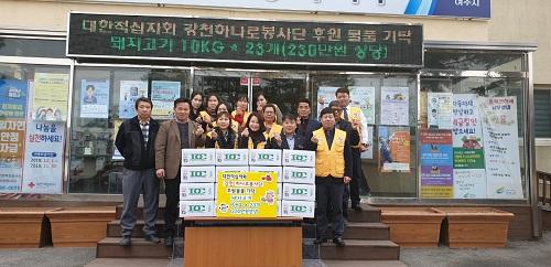대한적십자회 강천하나로봉사단는 지난 22일 독거어르신들에게 전해 달라며 돼지고기 10㎏들이 23세트를 강천면에 전달했다.