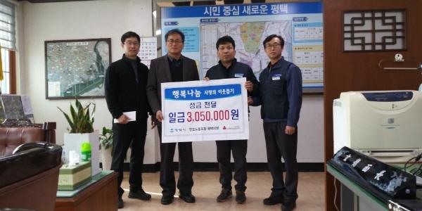 만도노동조합 평택지부는 지난 22일 강종희 지부장, 최중호 부지부장 등 4명이 참석한 가운데 연말연시를 맞아 소외계층과의 나눔을 위해 실시한 바자회 수익금 305만원을 이웃돕기 성금으로 현덕면에 기탁했다.