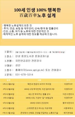 초고령화 사회에 노후의 행복지수를 높이기 위해 안성시 중앙도서관에서는 ‘100세 인생 100% 행복한 百歲百幸 노후설계’를 오는 2월 12일부터 3월 26일까지, 매주 화요일 10시부터 2시간동안 진행한다.