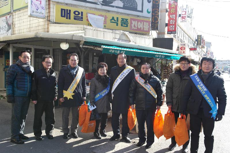 포항시의회(의장 이칠구) 경제산업위원회(위원장 방진길)는 25일 다가오는 설을 맞이하여 ‘골목형시장 육성사업’으로 선정된 연일시장을 찾아가 서민들의 목소리를 경청하고 장보기 행사를 가졌다. 이 날 전통시장 활성화를 위해 행사에 참여한 방진길 위원장과 백강훈 부위원장을 비롯한 7명의 경제산업위원회 위원들은 연일시장 내에서 점심식사하고 온누리상품권으로 제수용품을 구입하였다. 또한 어려운 경기속에서도 웃음을 잃지 않고 열심히 생업에 종사하고 있는 상인들을 격려했다. 방진길 위원장은 “연일시장이 골목형시장 육성사업으로 선정되어 특화환경조성 등 각종 지원을 받게 되는데, 시에서도 많은 노력을 기울이겠지만 성공적인 사업이 추진되려면 상인들의 적극적인 협조가 필요하므로 꾸준한 관심을 부탁한다”며, “우리 위원회에서도 의회차원의 적극적인 지원을 펼치겠다”고 했다.// 심후보 기자 sky626201@naver.com