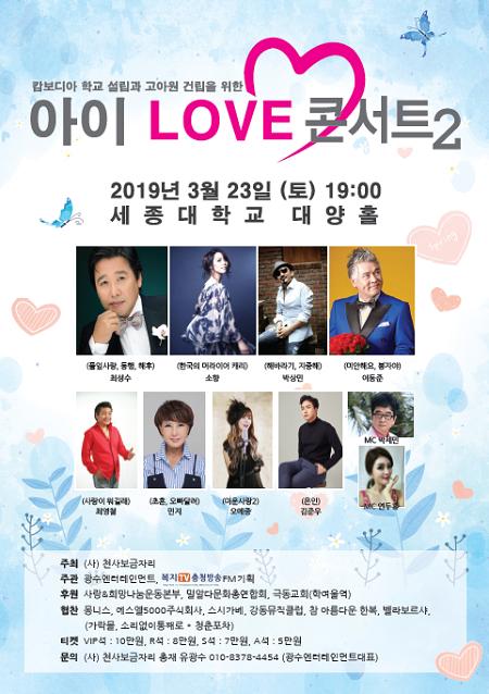 캄보디아 학교와 고아원 건립을 위한 사랑의 자선공연 아이 러브 콘서트2가 오는 3월 23일 오후 7시 세종대 대양홀에서 열린다.지난해 9월 29일 첫 공연에 이은 시즌2 무대다.