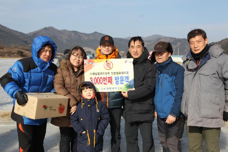 포항시 최고 오지마을인 죽장면 상옥리 전통 얼음썰매장이 포항은 물론 외지 관광객들로부터 인기몰이를 하면서 24일 방문객 3천명을 돌파했다. 이날 영예의 주인공은 포항시 양덕동에서 썰매장을 찾아 온 김재학씨 가족으로 뜻밖의 행운을 잡은 김씨 가족에게는 전국 최고의 맛을 자랑하는 상옥친환경 사과와 축하 꽃다발이 증정됐다.
