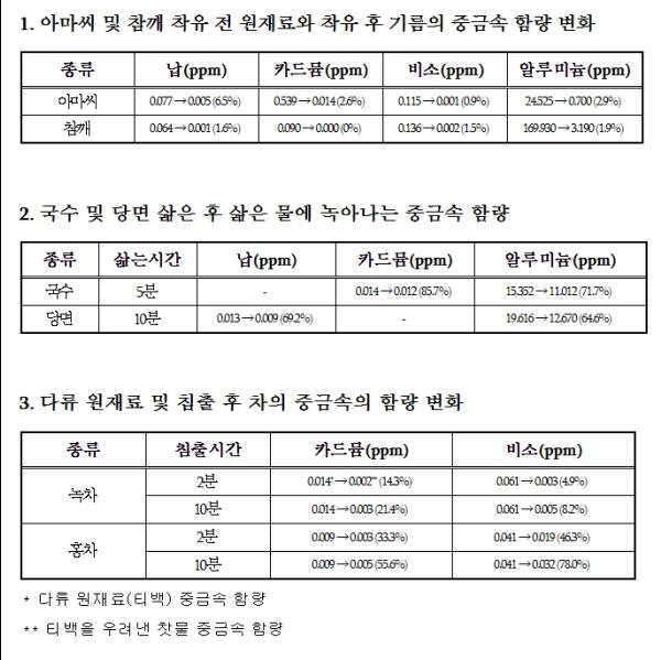연구 방법으로 식용유지 원재료, 다류, 면류를 대상으로 착유, 추출, 삶기 등 방법에 따라 가공·조리 전후의 중금속 함량 변화를 조사했다.