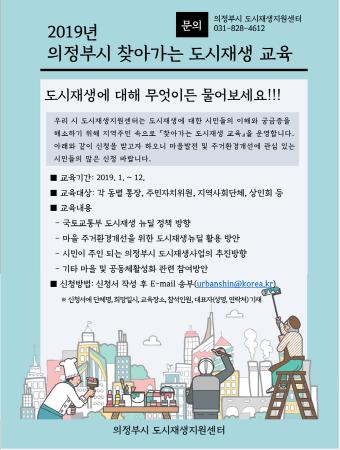 의정부시 도시재생과와 도시재생지원센터는 오는 25일 자금동 주민센터에서 진행되는 자금동통장단협의회를 시작으로 2019년도 ‘찾아가는 도시재생 교육’을 연중 운영한다.