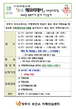 양주시 치매안심센터는 치매예방교육 ‘365메모리데이’ 참여 대상자를 선착순 모집한다.